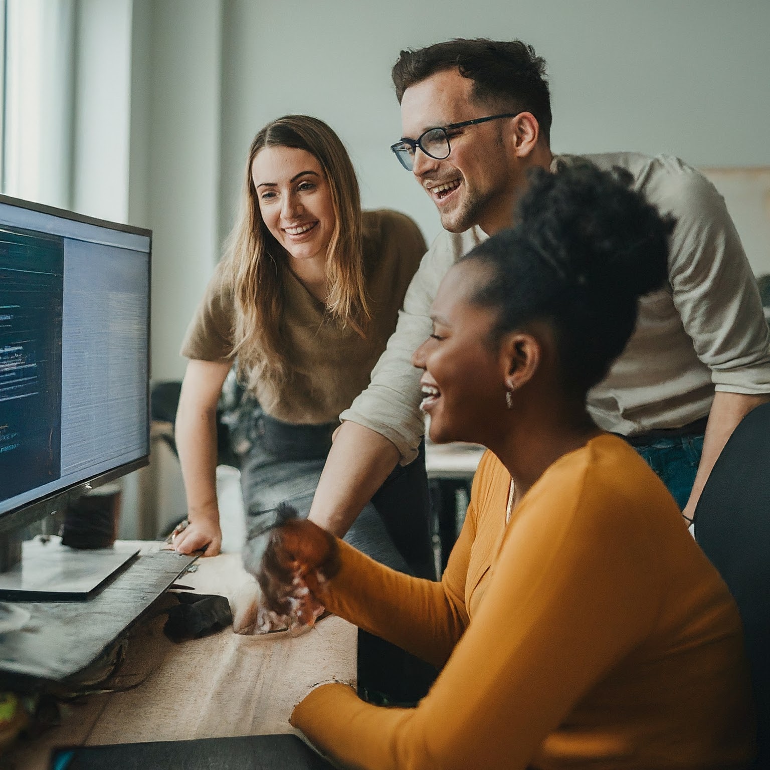A diverse group of people working together on a computer screen, looking at code and data visualizations.